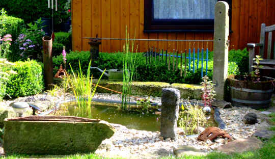 Hallo,na das sieht schon etwas besser aus. Bei den nächsten Bildern könntest Du diese evt. mit ca. 700x500 oder gar 800x600 Pixeln einzustellen. Da kann man einfach mehr erkennen.Meiner Ansicht nach ist die "Verbindung" zum Schuppen zumindest räumlich vorhanden. Wenn Du den Gehweg nicht brauchst, könntest Du das Beet ganz an den Schuppen heranführen. Das muss aber nicht sein.Entscheidender finde ich, wie Dein Beet als solches insgesamt gewinnen kann. Ganz ehrlich, den Betonringen mit Stange kann ich nichts abgewinnen. Das wirkt wie ein beziehungsloser Fremdkörper. Stattdessen würde sich hier eine Leitpflanze gut machen. Eine kleine Gruppe von Rudbeckia salicifolia z.B., die an Wasserfontainen erinnern. Auch eine Hochstammrose könnte ich mir da vorstellen oder ein säulenförmiges Gehölz. Wenn Du tatsächlich ein Wasserelement möchtest, würde ich ein echtes kleines Wasserbecken, Trog, Quellstein, etc. einplanen. Es gibt zudem viele, auf mich unruhig und zufällig wirkende, unterschiedliche Details und Elemente: Stuhl, Vase, viele unterschiedliche Steine, ein Weg und .... Auf kleinem Raum wirkt das meist verwirrend. Idealerweise würde ich mich für EINEN roten Faden entscheiden, eine Idee, die ich umsetzen würde. Entweder ein konsequentes Kräuterbeet, oder ein Staudenbeet, ein formales Beet, ein naturnahes Beet usw. Möglicherweise verlangst Du Deinem kleinen Beet zuviel ab. Weniger ist ist hier ganz klar mehr.Mein Vorschlag wäre: weg mit dem Betonringelement, so wenig Deko wie möglich, deutlich weniger Steine, ein erkennbares Pflanzkonzept (Kräuter ODER Stauden ODER Rosen, obwohl man mit viel Feingefühl diese Pflanzen auch kombinieren könnte), ein schmaler Weg könnte bleiben. LGJo
