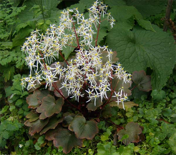 Als erstes einen Klassiker, Saxifraga cortusifolia var. fortunei 'Rubrifolia', eine europäische Sorte, die nicht genug gelobt werden kann und gerade jetzt ihre glitzernden Blütenrispen eindrucksvoll durch die herrlichen dunkelweinroten Blätter schiebt.