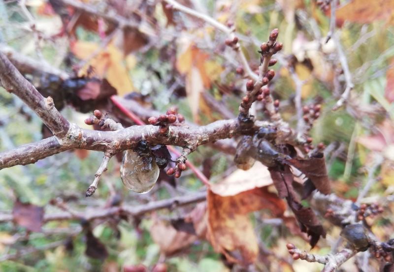 Diesmal betrifft es Prunus incisa Kojou-no-mai. Sie hat sehr unter einem Baum gelitten, der im Vorjahr auf sie gefallen war. Der Hauptast fehlt, andere wurden verletzt. Dieses Jahr kam noch die Trockenheit dazu. Jetzt haben fast alle Zweige dicke Tropfen Gummifluss. Ich fürchte, das renkt sich nicht mehr ein.