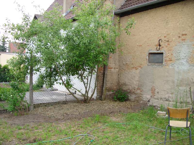 Der Garten ist nicht so klein, aber in dieser Ecke muss noch etwas Platz für einen kleinen Sitzplatz bleiben, weil es der erste und eigentlich auch einzige Schattenplatz im Sommer ist. Durch die Scheune und den Baum ergibt sich ein sehr angenehmes Kleinklima in unseren doch ziemlich heißen Sommern - deswegen ist da auch der olle Stuhl auf dem Foto
