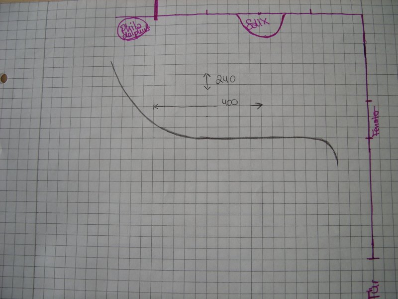 Ich hab mal eine grobe Skizze gezeichnet, wie ich mir die Beetform so vorstellen würde. Nach links geht das ganze dann mit dem Philadelphus in eine Blütenhecke über und vor der Scheunenwand würde ich die Bepflanzung halt gerne schlank halten wollen, wobei es da jetzt nicht auf 20 oder 30 cm mehr ankommen soll.