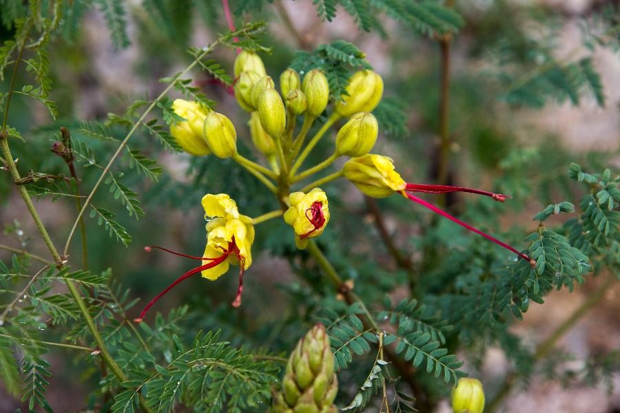 An Vegetation fielen zunächst einige typische mediterrane Vertreter auf: Zypressen, Oliven, Granatapfel, Palmen. Hier der Paradiesvogelstrauch (Caesalpinia gilliesii).