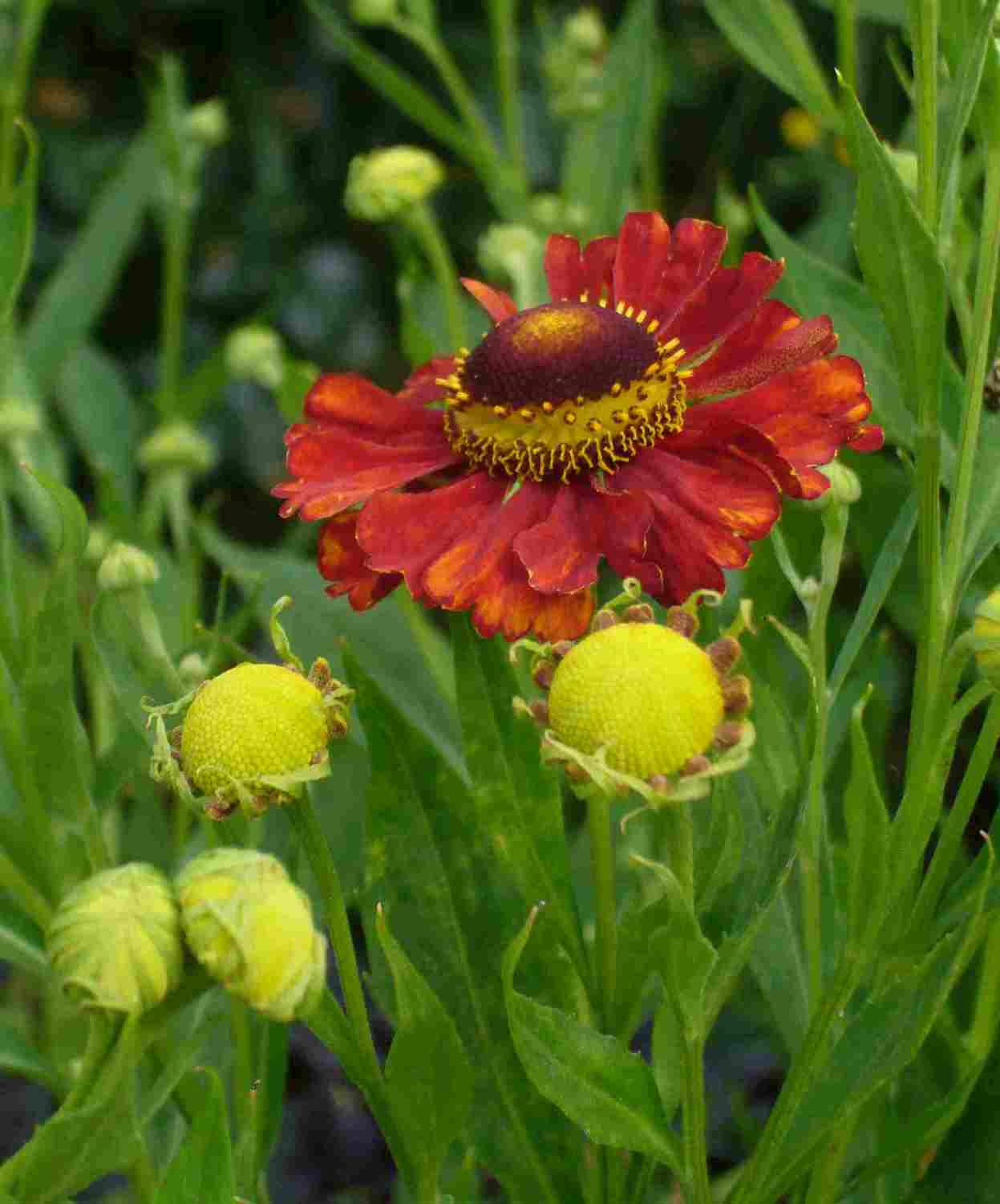 Nur hinken die in Sachen Helenium sehr hinter der Realität her! Da hat sich in der Zwischenzeit eine ganze Menge getan.Ich tippe bei obiger Blüte auf 'Meranti'. Die etwas breiteren Blätter und die Höhe sind neben der Blütenfarbe typisch für diese Sorte, die sich aber auf Anhieb schwer von 'Rubinzwerg' unterscheidet.Bei Helenium ist Sortenraten wie bei vielen anderen Arten leider oft Stochern im Nebel. Dazu ist das Sortiment zu umfangreich und über die Jahre zu viel durcheinander geraten.Einen Überblick über gängige und halbwegs sicher identifizierte Handelssorten gibt die Staudensichtung.Was für eine Sorte könnte das sein? Kupferzwerg?