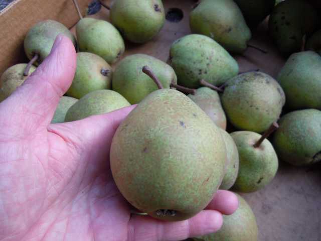 Die obige Birne ist wohl wirklich eine Winterbirne, denn sie ist immer noch hart.Hier hab ich eine andere Birne von einem alten knorrigen Baum. Der Baum hat eine auffällig dicke, fast schon korkige Rinde.Die Birnen haben eine zusammengequetschte Blüte, sind noch sehr fest, schmecken aber süß.Die Früchte sind irgendwie plattgedrückt und auf der Blütenseite gibt es spitze Beulen.