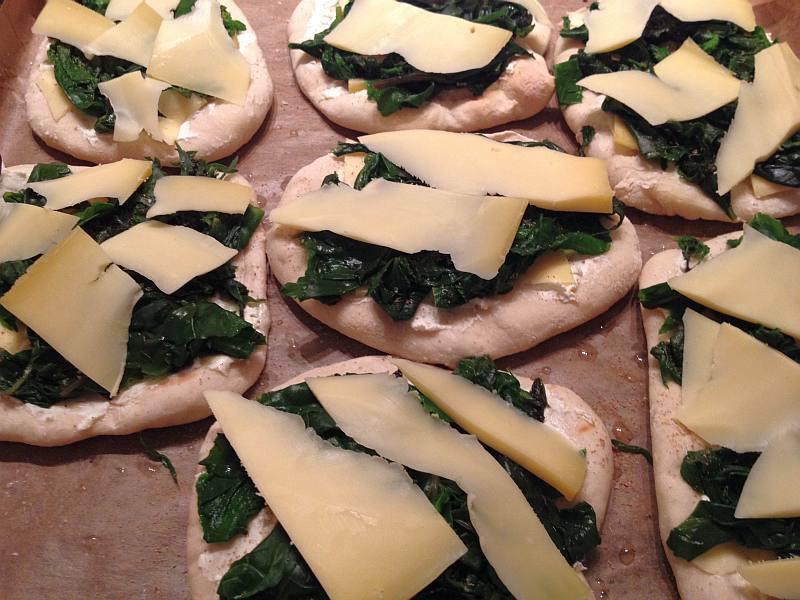 gestern abend gab es schnell noch einen tiefkühlberäumungssnack - minipizze mit dauerspinat (schnittmangold) und gouda