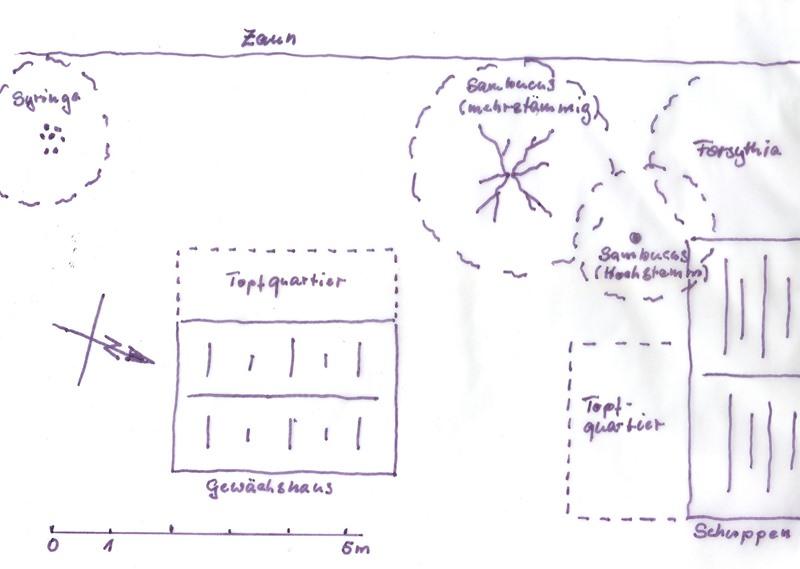 Heute früh habe ich ausgemessen und eine Skizze der Ist-Situation angefertigt.Der auf dem zweiten Bild noch zu sehende Stamm einer alten, maroden Pflaume wird in den nächsten Tagen hoffentlich gerodet.Dann bleiben auf einer Fläche von 11 x 5 Metern zwischen dem Syringa vulgaris und der Forsythie nur noch der mehrstämmig aufgeastete und der hochstämmige Holunder stehen.Bisher ist der Plan, entlang des Zauns einreihig eine Blütensträucherhecke zu pflanzen, damit ich rasch wieder Sichtschutz zum Nachbargrundstück bekomme. Sie soll also relativ eng gepflanzt werden und muss daher schnittverträglich sein. Sie darf zudem nicht so hoch werden, damit die Krone des Holunders und eines Acer davidii zur Geltung kommen, der mittig in das freie Loch kommt.Etwa knapp über dem Nordpfeil soll der Aver griseum gepflanzt werden, den ich als selbst gezogenen Hochstamm auch schon im Topf habe.Die Positionierung der Sträucher ist noch offen aber ich denke daran, hier kleinere Sträucher, wie Hortensien u. ä. locker zu verteilen. Für die Unterpflanzung schwebt mir etwas recht "schlichtes" vor. Vielleicht Schattengräser, einfache Hosta und einheimische Farne, die ich auch selbst herangezogen habe.Anregungen, Kritik und Pflanzenvorschläge nehme ich gerne entgegen.