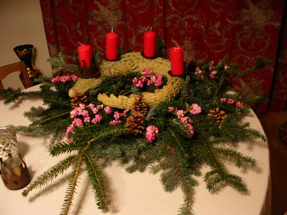 Schön die Vielfalt.Ich habe nur ein einfaches Gesteck für unser Krokodil. Es gab keine anderen Beeren auf dem Kompostplatz als diese Symphoricarpos x doorenbosii (kannte ich auch noch nicht).Meiner Liebsten gefällt diese Kombination von ihren roten Kerzen und meinen ( ) rosa Beeren gar nicht. Ich finde es spannend obwohl ich pink eigentlich gar nicht mag. Vermutlich muß ich morgen was anderes besorgen.