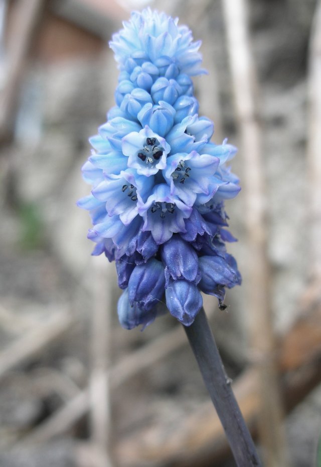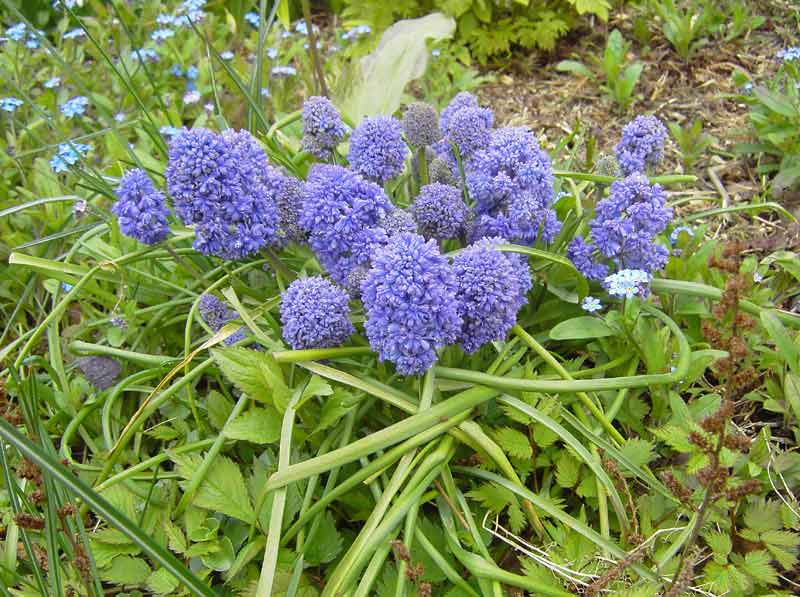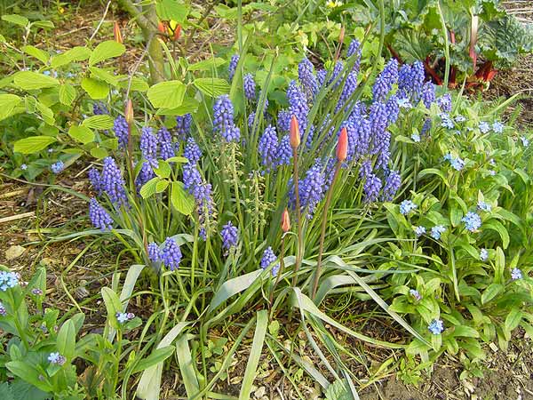 In der Regel nicht sehr aufregend, aber manchmal doch ganz hübsch sind Muscaris. Hier mal die einfachen M. armeniacum mit ein paar schönen rot-gelb gestreiften Tulpen dazwischen. Es gibt aber bestimmt noch eine Menge andere Sorten in Euren Gärten, oder?