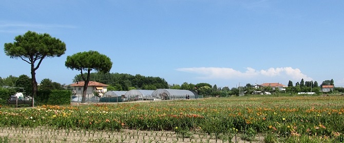 Das Areal liegt wenige Minuten Autofahrt nördlich von Rimini in wenigen hundert Metern Entfernung zum Strand. In der Baumschule gibt es viele getopfte Pflanzen auf schattierten Verkaufsflächen – dort konnte ich auch noch viele blühende Hems fotografieren, wo hingegen in den freien Pflanzungen im Feld schon viele Sorten Ende Juni verblüht waren.