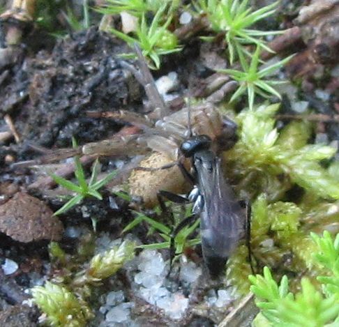 Im Moorbeet habe ich heute wieder mal eine kleine Wespe beobachtet. Das sie irgendwas jagt um es in einer Röhre mit einem Ei zu bestiften war mir schon klar. Ich wußte nur nicht obe sie hinter den kleinen Heuschrecken oder hinter Spinnen her ist.Hier habe ich sie mit einer gelähmten Spinne in flagranti erwischt.Wer den Diney Film die Wüste lebt kennt wird sich sichr an die goße schwarze Wespe und die Tarantel erinnert weiss was ich meine. Hier halt ein paar Nummern kleiner. Das Tier ist so lebhaft das nur ein einziges Foto halbwegs scharf war.