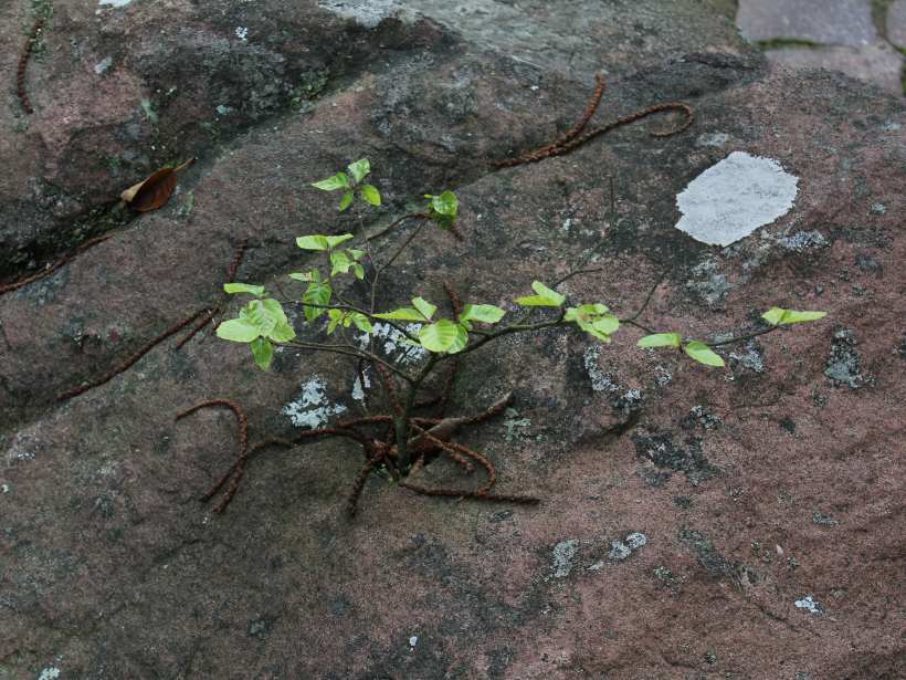 Kübel: Sandstein, einige Tonnen. Innendurchmesser 50mm.Fagus sylvatica, ca. 30 Jahre.Kein Kultursubstrat eingebracht. Nie gesät oder angepflanzt. Nie gegossen. Nie gedüngt. Nie geschnitten.Seit mind. 15 Jahren kein erkennbarer Zuwachs.