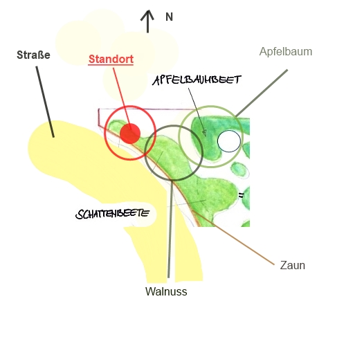 ... für einen halbschattigen Standort.Der Untergrund ist durchlässig, kalkhaltig und der Standort befindet sich nordwestlich eines mittelgroßen Walnussbaums, der aber in seiner aktuellen Größe im Zaum gehalten (gestutzt) wird. Er würde das neue Gehölz vom Morgen bis etwa 14 Uhr licht beschatten, dann hätte das Gehölz Sonne bis zum Abend. Die Stelle an sich ist sehr prominent, die Pflanze würde hinter einem Holzzaun an der Einfahrt unseres Grundstücks den ersten Platz belegen und ist gut sichtbar - von außerhalb sowieso, aber auch von innerhalb, denn mit dem Nussbaum beginnen meine Schattenbeete. Zur Verdeutlichung ist eine (ich hoffe halbwegs verständliche) Skizze angefügt.Der Strauch sollte nicht zu schnell wachsen und vom Wuchs her schön sein, gerne verzweigt und nicht zu aufrecht, sondern eher "waldbaumartig" breit. Ich würde dahinter und drunter gerne ein Schattenbeet anlegen, daher soll es unbedingt ein nicht zu dichter Laubbaum sein.Bezüglich Blüten und Laub bin ich offen, Panaschierungen aber nicht, Blüten eher unauffällig, aber kein Muss. Ich bin eher Fan von zarteren Dingen, als weniger eine Magnolie. Bisher dachte ich entweder an eine Hamamelis oder Cercis (gefällt das denen überhaupt dort?) oder eine schöne Zierkirsche - es muss nicht exotisch sein, darf aber! Und ich kenne zu wenig Gehölze, vielleicht gibt es etwas, das genau dorthin passt wie die Faust aufs Auge. Danke, ich freue mich auf eure Ideen - bisher war immer sehr hilfreich, was mir hier im Arboretum vorgeschlagen wurde!