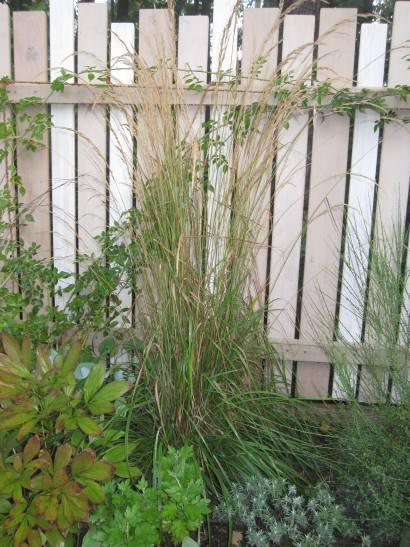 Da es weder weiß noch rötlich blüht noch gestreift ist, muss mein Reitgras wohl 'Karl Foerster' sein. Gepflanzt im Frühjahr 2013 (damals aus einem 9er Topf) und zur Orientierung: Der Zaun ist ca. 150 cm hoch.