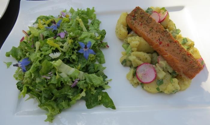 Wir hatten am Montag Kartoffelsalat mit Radieschen und Rucola, dazu Stremellachs.