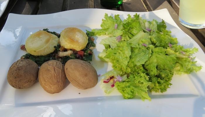 Am Donnerstag gab es Pellkartoffeln mit erstem Gartenmangold und gebackenen Ziegekäsetalern.