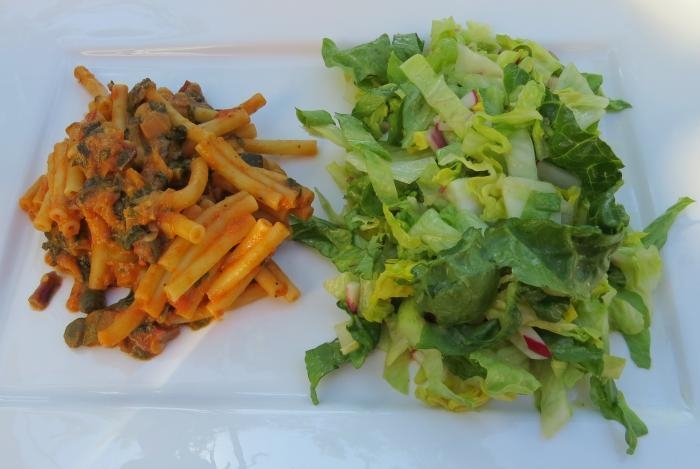 Heute hatten wir Maccheroni mit einer Käse-Tomatensoße, die mit Mangold, Zucchini und Kapern angereichert war.