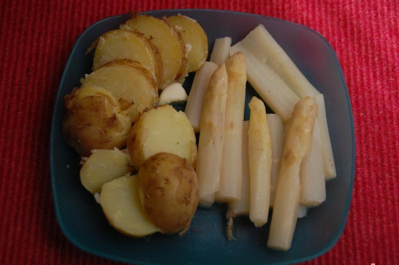 Die Ziegenkäsetaler schauen gut aus.Hier gab es heute neue Pellkartoffeln mit Spargel aus der Pfanne.