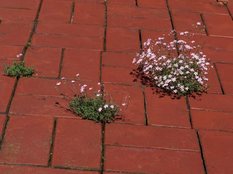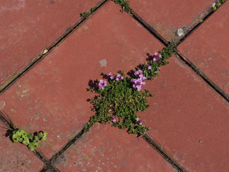 Da waren früher wunderbare Bodendeckerrosen drauf, 'Weiße Immensee', einfach blühend, Bienenfutter. Die Teile hatten nur einen Nachteil: 6 Meter lange Triebe jedes Jahr und blutende Hände nach jedem Pflegegang. Nach einem Anfall der Radikalrodung habe ich wohl immer wieder einmal Samen von Einjährigen verstreut, gekeimt ist wie das so häufig ist genau das, was nicht geplant war. Inzwischen verselbstständigt sich alles, Oregano vulgare ist im Moment straff auf dem Vormarsch