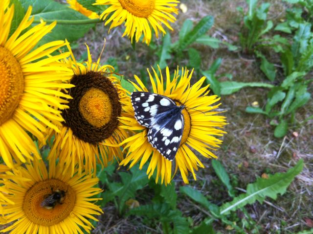 Seit kurzem sind hier auch mehr Schmetterlinge unterwegs, u.a. auch der Schachbrettschmetterer