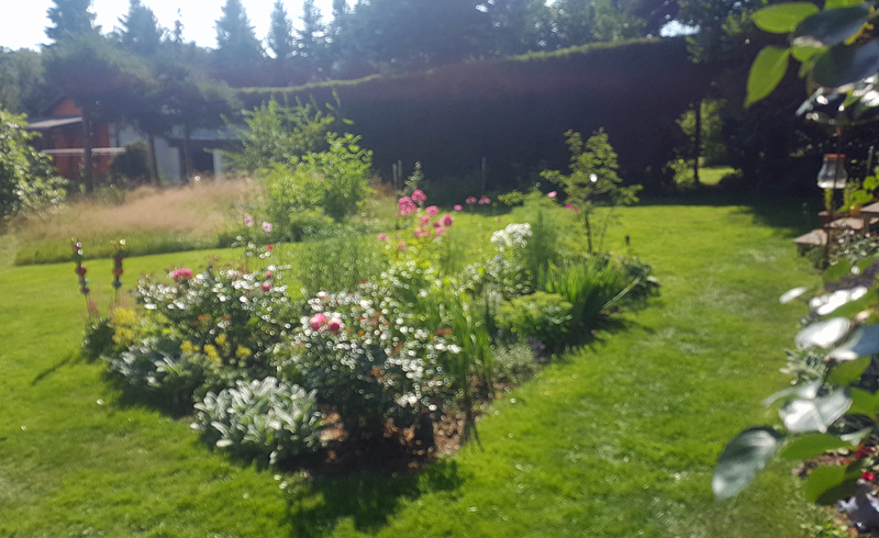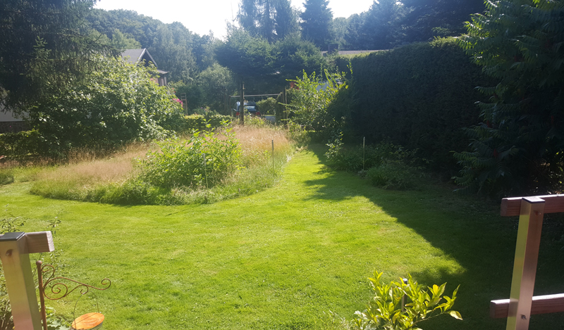 Blick gen Südost:Rechter Hand die Ausläufer der wilden Wiese.geradezu unsere Waldbäume (Fichte, Lärche) und eine natürlich gestaltete Treppe, die zum unteren Gartenteil (Schuppen, Kompost etc) führt)Zwischen Bäumen und Bank ein terrassenförmig angelegtes Schattenbeet mit Funken, Farnen und einem (noch kleinen) Japan-Ahorn.Dort, wo die Bank steht, soll nächstes Jahr ein ca. 3x3 Meter große Holzdeck hin. Den Platz haben wir uns ausgesucht, weil wir dort öfters sitzen (schöne Morgensonne, schöne Abendsonne)In der Bildmitte: Staudenbeet mit Rose, Rittersporn & Co. An der vorderen Spitze eine Felsenbirne (noch klein, letzten Herbst gepflanzt).Etwas Rasen möchte mein Männe gerne noch behalten - fürs Auge.