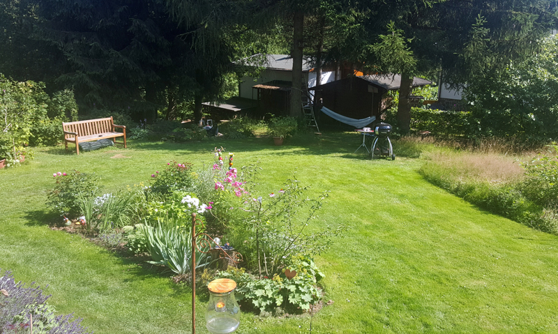 Hallo zusammen,Wir wohnen seit Mitte Mai auf einem 900 qm großen Grundstück am Rande des Südharzes. In den letzten Jahren haben wir bereits einiges im Garten gemacht, angepflanzt, umgepflanzt, rausgerissen.hinterm Haus entsteht z.Z. eine Gemüsegarten. Vor dem Haus, habe ich noch einiges zu tun, dort möchte ich gern noch etwas umgestalten. Es wäre schön, wenn ihr mir dabei mit euren Ideen und Tipps helfen könnt.Die Basisdaten:ganz leichte Hanglage, gen Süden ausgerichtet, lehmiger Boden.Was ich mir wünsche:etwas mehr "Raum" - oder besser Räume & Perspektiven. Zur Zeit kann man mit einem Blick von der Terrasse die ganze Fläche erfassen.Der Garten soll seinen natürlichen Charakter behalten, wir wohnen hier direkt am Wald. Da passen meiner Meinung nach keine formale Hecken, wir wollen auch keine klassischen gepflasterten Wege anlegen. An Pflanzen mag ich alle Arten von Blühsträuchern, Stauden, Farne, Funken, Taglilien… Ich scheue mich im Moment, da Sträucher o.a. anzupflanzen - mir fehlt etwas die ordnende Hand...Ich bin gespannt auf Eure ersten Antworten - vielleicht könnt ihr mir ja etwas auf die Sprünge helfen.Erstmal eine Skizze - Bilder und Beschreibung folgen
