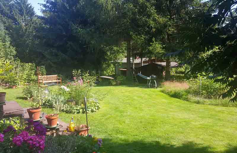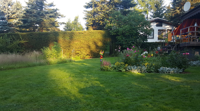 SouthernBelle, ja an der südlichen Grenze (hinter dem Hartreigel) geht eine halbhohe Hainbuchenhecke lang (die ist noch im Wachsen)Links das Haus der südlichen Nachbarn, das Blaue (geradezu) müsste das Auto der Nachbarn sein - das steht da nicht immer.Die insgesamt drei hohen Bäume - ja, die stehen da halt. Die sollen auch nicht weg. Die bringen Schatten, das ist unser "Wald".Hauptblickrichtung vom geplanten Deck ist Westen - in das Tal in den Süden kann ich da nicht gucken, da sind Nachbarhäuser davor. Du hast recht - im Moment schaue ich einmal quer über die wilde Wiese zur Fichtenhecke - im Vordergrund das Staudenbeet.Ich hätte gern etwas (kleine Bäume? Sträucher), was diese "Querdrüber"-Blicke unterbricht, scheue mich aber, da wahllos etwas hinzupflanzen.1min. Beitragsanzahl noch nicht erreichtBlick nach Sueden:was sehe ich da im naeheren Hintergrund, ist das eine geschnittene Hecke vom Nachbarn? Links ein Nachbarhaus und das blaue- eine Rasentraktor? Steht der da immer? Auf Deinem Plan stehen links an der suedlichen Grenze potentiell sehr hohe Baeume: warum? Wenn der Blick nach Sueden das bewaldete Tal sein soll, wuerde ich versuchen, alles andere auszublenden und den Blick direkt dorthinzuleiten. Was willst Du von dem geplanten Deck aus sehen, auch das Tal? Wenn das der ideale Platz ist, braucht es vielleicht "Scheuklappen" gegen die 3m hohe Fichtenhecke?