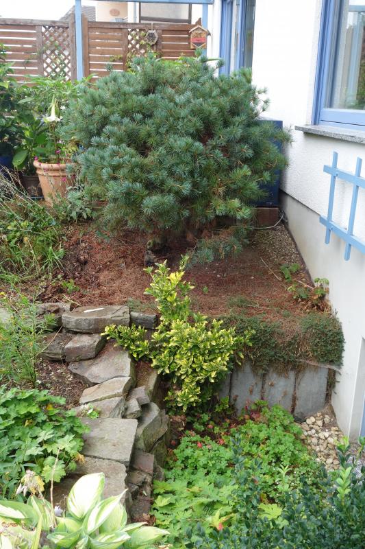 Am Rand des Steingartens, teilweise unter dem Dachüberstand, steht eine Mädchenkiefer Pinus parviflora 'Negeshii', die mir dort nicht mehr gefällt. Obwohl ich jedes Jahr den Neutrieb pinziert hatte, ist sie einfach zu groß geworden und sie gefällt mir auch von der Form nicht mehr.Als Gartenanfänger hatte ich die Formulierung "langsamwüchsig" zu wörtlich genommen...Damit wieder mehr Licht ins Wohnzimmer kommt, habe ich sie jetzt erst einmal etwas eingekürzt, möchte sie aber längerfristig auf jeden Fall ersetzen.Die Hauswand ist die Westseite, vom frühen Nachmittag an kommt also Sonne an die Stelle.Durch den Dachüberstand kommt selten Regen an die letzten 30 cm der Wand, es ist dort also recht trocken.Was ich mir wünsche:Ein immergrünes kleines Gehölz, sollte wohl nicht höher als gut 1 m werden, auch nicht allzu breit, gerne etwas bizarr wachsend. Die derzeitige Kugelform finde ich langweilig.Die Wurzeln sollten eher tief gehen, damit ich möglichst wenig kostbaren Pflanzplatz verliere.Kiefer wäre eigentlich ganz passend, aber vielleicht habt ihr ja auch noch ganz andere Ideen.So sieht es zur Zeit aus: