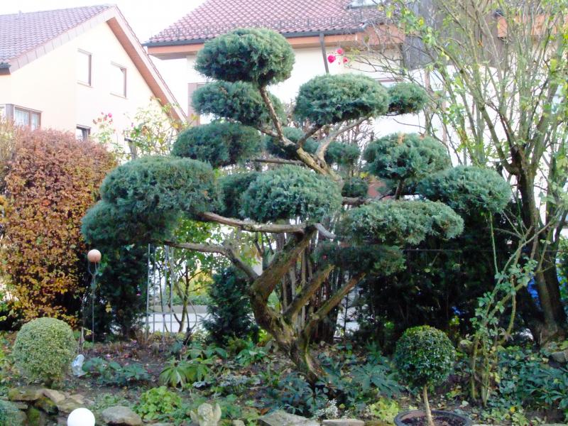 In einem anderen Thread habe ich das gute Stück schon mal gezeigt.Juniperus pfitzeriana, der nur noch als dicker Bollen hinter dem Teich saß.Nach und nach habe ich den ausgedünnt und die verbliebenen Äste zu Wolken geformt.So was kostet bei uns im Gartencenter zwischen 3500 und 4000 Euro.