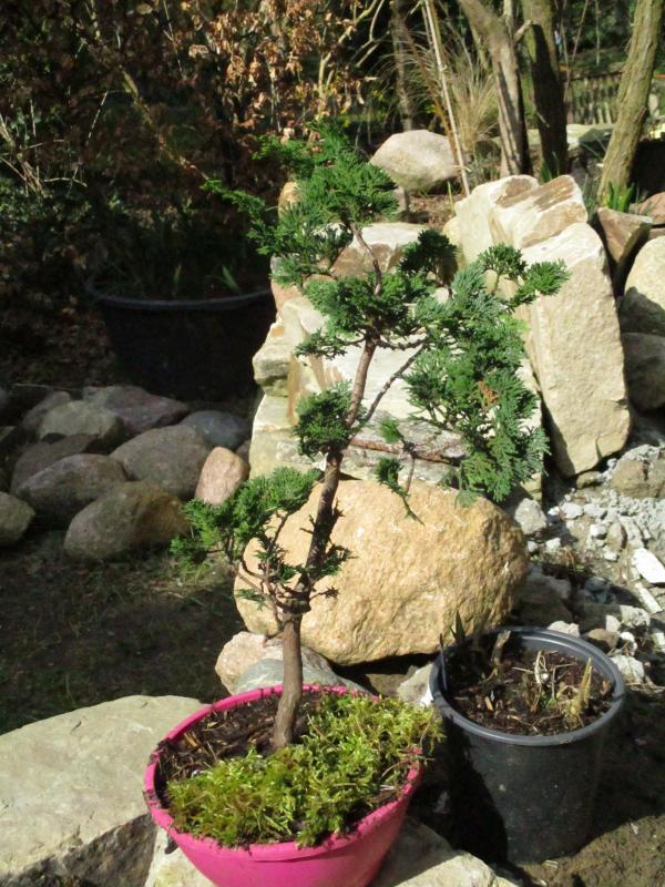Neuzugang: eine Muschelzypresse(?) vom Friedhof mitgenommen. Die musste dort einer Azalee weichen und ich fand sie zu schade zum wegwerfen. Sie hat eine schöne Form, auf die man aufbauen kann :D. Aber sie bleibt fürs Erste im Topf. Den Haupttrieb habe ich schon gekappt. Mal sehen, wie sich das nun entwickelt.