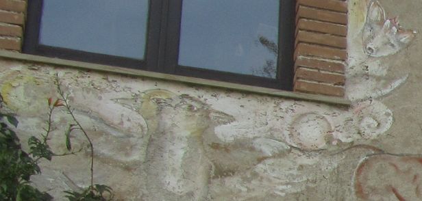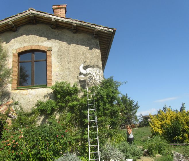 Ich hatte eine Gelegenheit den Wunsch einer Künstlerkollegin zu erfüllen. Ich sollte die von der Sonne aufgefressenen Bilder die sie an Ihr Haus gemalt hatte übermalen. Meine wilden Tiere faszinieren sie.Ganz konnte ich das aber nicht übers Herz bringen. So habe ich eben meine wilden Kühe und Stiere in die Lücken gesetzt oder eingefügt. Eigentlich wollte ich nur eine Tuffsteinhöhle einweihen. Aber das kommt noch war aber viel archaischer als geplant.Begonnen habe ich mit einem Stierkopf auf einer leeren Hausecke über einem 4 Meter Hohen Rosengeranke. Da sah ich schon einen Stier im Putzgefüge. Die Risse und Schründe ließen ihn vor meinen Augen fast durchbrechen.Das Auge, der Wulst darüber und die Wolle auf der Stirn war praktisch schon da.