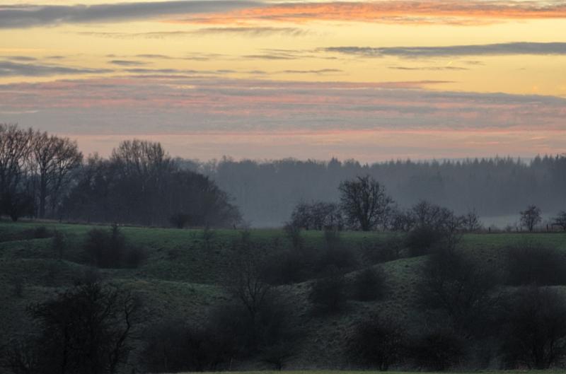 Die Spatzen sehen hungrig aus. Heutiger Sonnenuntergang an den in der Nähe befindlichen Erdfällen. Die Landschaft ist hier unterirdisch ein schweizer Käse...