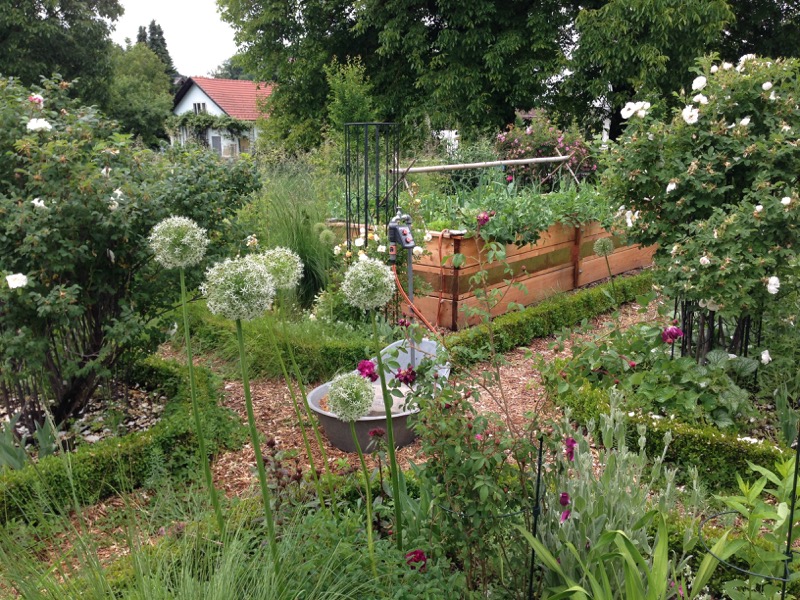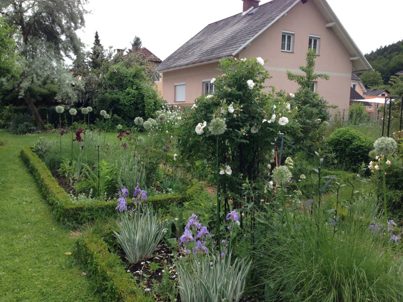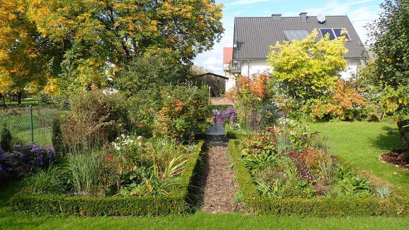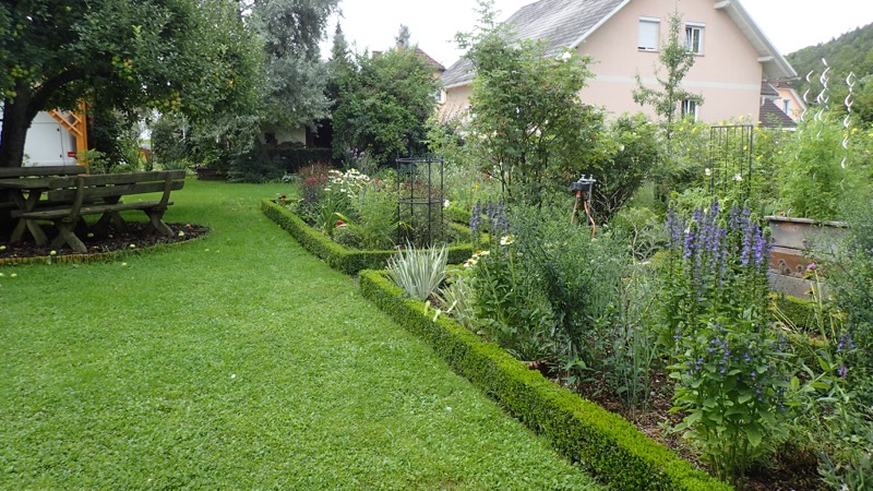 Jetzt hab ich lange nachgedacht, welchen Titel ich meinem Faden geben soll......Zuerst das Problem:Meine Buchsumrandung (Bilder sind von heute) hat massiven Zünslerbefall, muss also weg. Ich bin für Neues offen - aber - die Staudenbepflanzung innerhalb der Beete mag ich lieber nicht ändern, da ich lange dran rumgetüftelt habe und jetzt damit endlich zufrieden bin.Die Geschichte des Gartenteils: Buschs habe ich vor 11 Jahren gepflanzt, die Beete waren bis 2010 Gemüsebeete, habe ich aber aufgelassen wegen der Schnecken und weil der Buchs die Beete 'leergefressen' hat. Dann, 2010, bekamen drei Beete innen Wurzelsperre wegen des Buchses und ich habe daraus 3 Staudenbeete gemacht, weiss mit gelb/orange, weiss mit blau und weiss mit rot. Das vierte Beet beherbergt mein Hochbeet. Dort, wo sich in der Mitte die Wasserleitung befindet, steht in jedem Viertel je eine Rose. Davon zeige ich euch noch später Fotos. Die Gräser bzw die weissen Stauden sind durchgängig dieselben. Der Gartenteil ist vollsonnig und trocken, auch dass habe ich beachtet.Es ist die Nordwestecke meines Gartens, dahinter, wie ihr seht, Wiese und ein Nachbarhaus. Bis zum Zaun befinden sich im Westen und im Norden: ein ca. 80cm Rasenstreifen und dahinter 80cm tiefe Beete die Zäune entlang. Am Zaun an der Westseite wachsen unter anderem 3 Eiben, die noch relativ klein sind und 6 Clematis. An der Nordseite sind es einige Rosen und dazwischen arbeite ich schon jahrelang an einer Eibenlehne für eine Gartenbank, ist aber noch nicht so weit.Ich habe im ganzen Garten Rindenhäksel als Beetabdeckung.Jetzt suche ich Ideen, wie ich den Charakter und die Innenbepflanzung der Beete ohne Buchs erhalten kann......