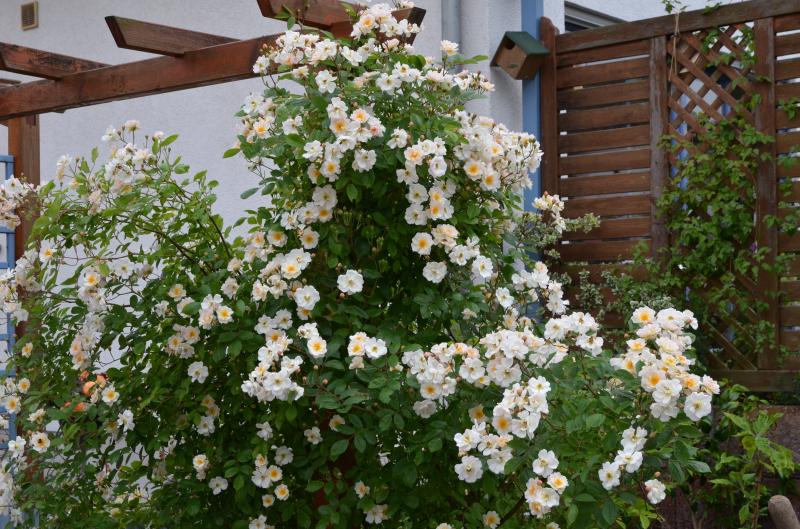 :DSchatten ist für Rosen immer schwierig.Nevada wird im Schatten schnell gagelig und vergreist.Frühlingsgold ist irrsinnig stachelig und schlecht zu biegen.Trier halte ich auch für eine gute Möglichkeit.Viele R.moschata vertragen Halbschatten.Gut im Halbschatten macht sich hier die recht großblumige Shropshire Lass.Sie hat aber eher rosaweiße Blüten mit sehr dicken ,gelben Staubgefäßen.Blüht nur einmal,aber lange.Die neuere ,englische Sorte Kew Gardens soll auch schattenverträglich sein.Hab da aber nur Erfahrungen am sonnigen Standort gesammelt.
