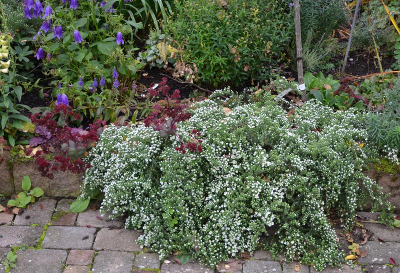 Auf der anderen Seite von Snowflurry steht Kalimeris, ist aber auf dem Bild verblüht.Das geht gut!...außerdem experimentiere ich mit Aster amellus Veilchenkönigin und mit Kalimeris.....Die Aster Snowflurry gefällt mir sehr gut.