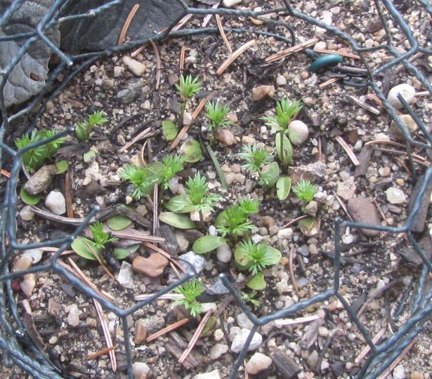 Mein Freund Uwe hat eine einzelne Pflanze Adonis vernalis. Die setzt regelmäßig Samen an. Oft stehlen die Mäuse die Samen von der Pflanze weg. Dagegen hat er Drahtkäfige gebaut.Letztes Jahr hat er mehrere Samenstände abnehmen können. Die hat er sofort an 7 Stellen ausgesäht. Mit ein wenig Substrat Ca. 1/2 bis ein Zentimeter abgedeckt. Substrat eine stark Sand und Kieslastige Mischung mit weniger als einem Drittel Humusanteil.Sie liefen nach wenigen Wochen zahlreich auf. Zwei fette Keimblätter.Die blieben einfach inverändert bis vor einigen Wochen.Da begannen sie die typischen winzigen Laubblätter zu schieben.An einer etwas humuslastigeren schattigeren Stelle schneller als an den anderen. Da habe ich mal besuchsweise kontrolliert. Es sah aus als wenn jemand an drei Stellen pikiert hätte.Da wo die meisten waren sind nur noch 3 oder 4 Pflanzen übrig.Uwe hat gleich Drahtkäfige drüber gemacht. Mein Verdacht ist das irgendein Vogel diese Sämlinge als Insektizid gegen Nestparasiten verwendet. Von einigen Vögeln habe ich beobachtet das sie büschelweise besonder Pflanzen ins Nest schleppen. Samenstände von Schachbrettblumen z. B. Dabei gehen sie nach meinen Beobachtungen Artrein vor. Das mit dem Insektizid ist natürlich nur eine Vermutung.Hier mal ein fortgeschrittener Fleck von heute