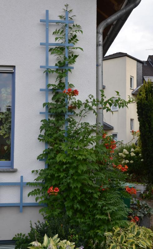 Temperaturtechnisch dürfte das für die wärmeliebenden Kaiserwinden (ehemals Pharbitis, jetzt wieder in Ipomoea eingegliedert, z.B. Ipomoea nil) ein guter Standort sein – die Frage ist nur, ob die Sonneneinstrahlung da zu Blattschädigungen führt. Was aber auf alle Fälle zurechtkommen sollte, sind die Sternwinden (Ipomoea lobata und Umfeld).Auf dem Foto sieht man noch die Holzwand unserer Garage. Schatten bis ca. 15 Uhr, dann knallt im Sommer die Sonne drauf. Die Hitze steht in der Ecke. Die Kletterhortensie, die da sitzt, verbrennt im Sommer. Gibt es außer Rosen noch etwas Kletterndes, was das verkraften könnte (auch Obst)?