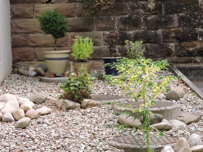 Ich lese mich zurzeit durch alte Gartenpraxisausgaben und bin in Nummer 4/2003 auf einen kleinen Artikel gestossen von einem Herrn Lilienthal mit dem Titel: "Probleme? Sehr gut!"Vermutlich ist der Autor ein Gartenplaner:"Was ich sagen wollte: Ich mag sie, die Schachtdeckel. Ich mag sie respektive das Problem, das sei beinahe immer sind."(Zitat)Hmmm...meine habe ich einige Jahre ignoriert, denn glücklicherweise stehen sie nicht gerade im Vorgarten. Dafür gibt`s einige davon, acht sind es wohl an der Zahl.Schachtdeckelsituationen und Poblemlösungsstrategien, also darum soll es hier ein bisschen gehen. Und nicht nur um den Umgang mit den Schachtdeckeln sondern generell um den Umgang mit optisch nicht sehr ansprechenden Gartenecken. Und wie sie einem dann doch vielleicht auch ein bisschen Freude machen können, ohne das man immer wegschauen muss.Eine relativ prominente Schachtdeckelsituation liegt bei uns neben der Garage. Im Sommer eine der sonnigsten Stellen. Ich hatte noch alte glasierte Töpfe in der Garage. Ich hatte (leider) keine Fetthennen in diesem Garten, weil Boden zu schwer und vollsonnige Standorte rar. Jetzt habe ich die Fetthennen hier, den Schachtdeckeln sei Dank!Vielleicht findet die eine oder andere "Schachtdeckelsituation" noch Einzug in diesen Thread?(Fotos vom letzten Jahr, es ist noch ein bisschen was dazugekommen. Buchs ist umgezogen, kleiner Ahorn eingezogen, eingeflogenes G. endressii gross geworden und dies Jahr gibt es viel Kreuzblättrige Wolfsmilch im Kies.)