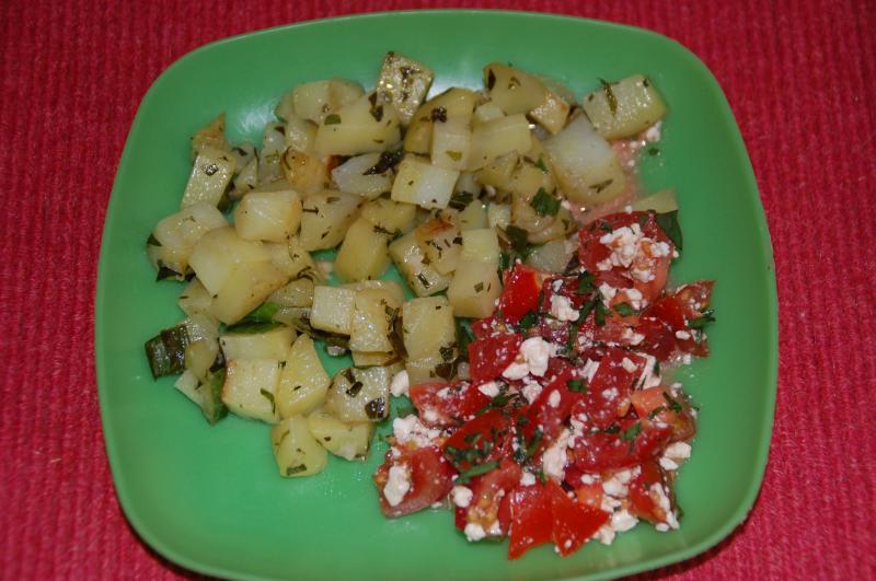 roh gebratene Kartoffelstückchen (mit S&P, Butter, viel Oregano, Zwiebellauch) und Tomatensalat (Tomate, Feta, viel Estragon, Salz, Zucker, weißer Pfeffer, Balsamessig, Olivenöl)