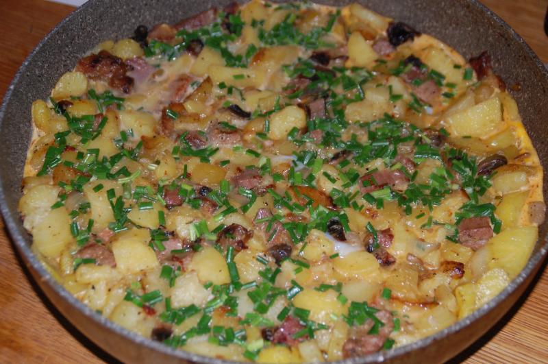 Bauernfrühstück (Kartoffeln, Zwiebeln, Speck, gegrillte Schweinekoteletts, Eier, S&P, Paprikapulver, Muskat, Schnittlauch, Champignons)
