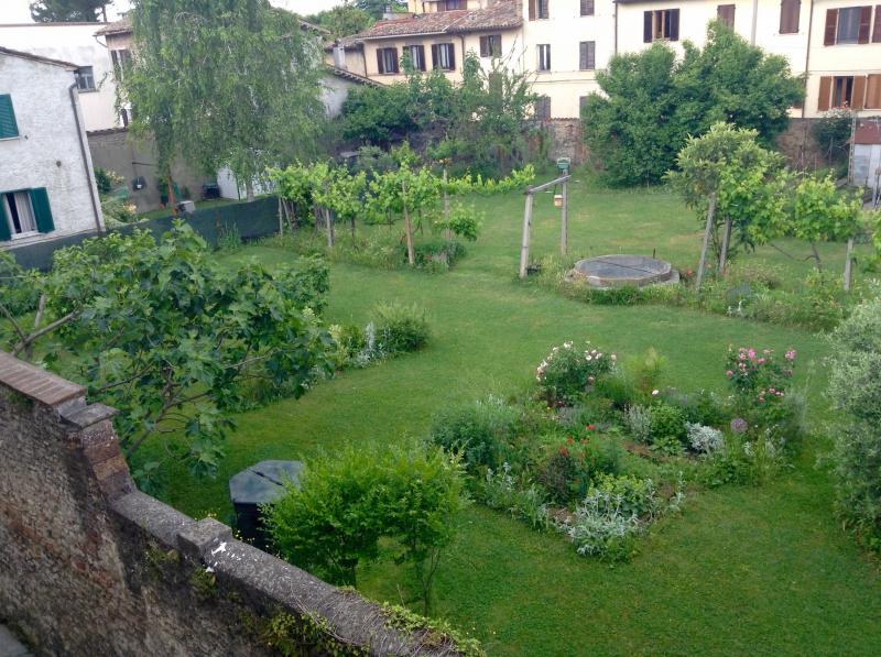 Der Garten ist etwa 1000 m2 groß, es gibt eine Zisterne und einen Brunnen. So sah es im Mai 2015 aus, von der Wohnung aus gesehen: