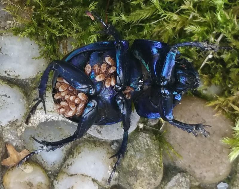 Die Milben reisen mit dem Käfer von einem Dunghaufen zum nächsten, geht schneller als selber zu laufen...
