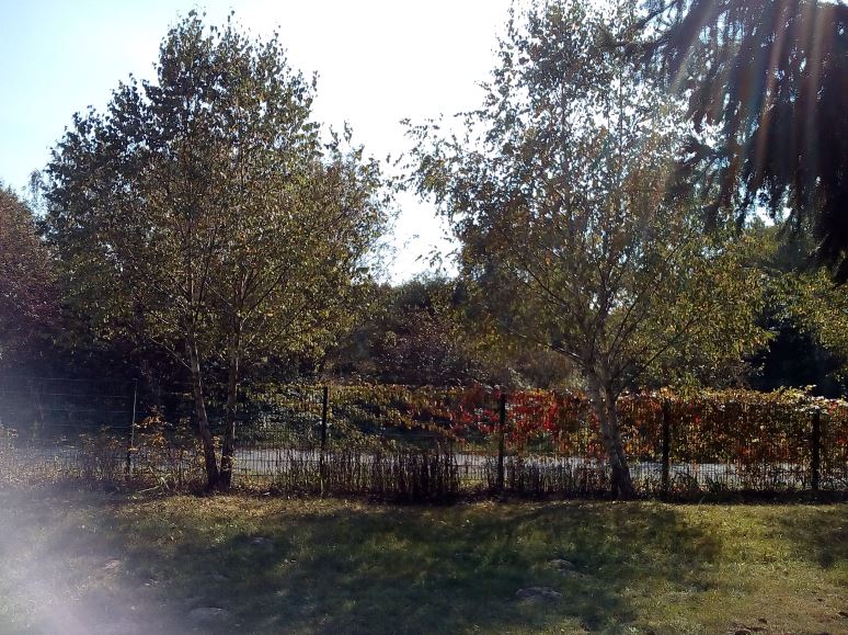 Hier mal ein Bild der beiden höchsten Birken - am Boden haben sie einen Stammumfang von 75 und 80 cm (um die jeweils beiden Stämme herum gemessen). Zur Höhe: Der Zaun ist 1.35 m hoch. Insgesamt sind es fünf Birken. :P