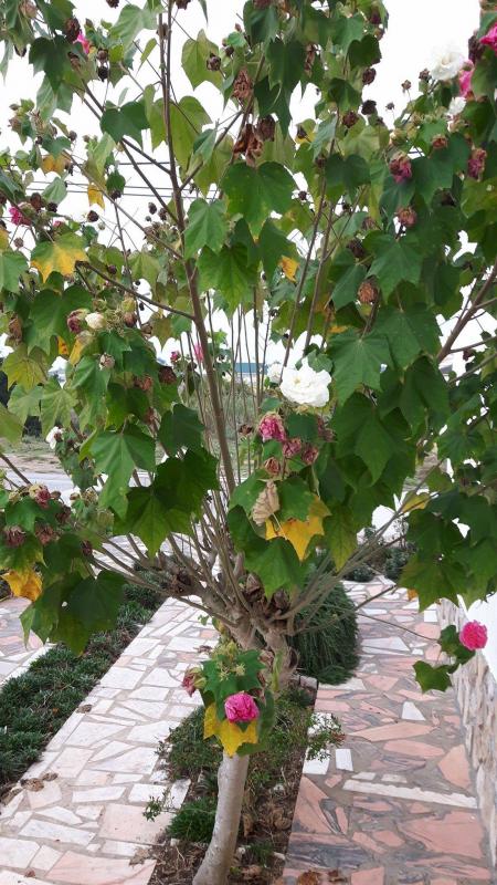 Das könnte ein Hibiscus mutabilis sein. Hab ich in Italien auch schon öfters gesehen.
