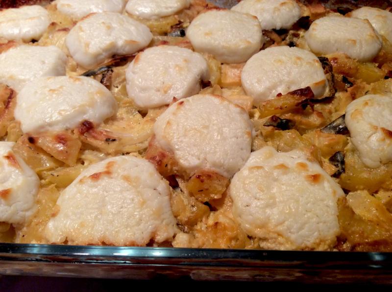 gestern abend gab es auflauf aus kartoffeln, gartenäpfeln, stoppelzwiebeln und etwas milder gartenchili mit ziegenfrischkäse