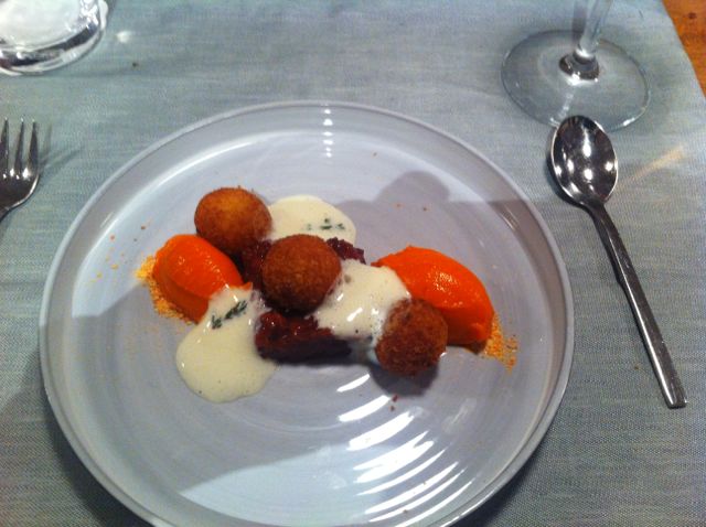 Als Nachtisch hatte ich Karotteneis mit kleinstgeschnippelten Zwetschgen, gewürzt mit Thymian, und Kartoffelbällchen.