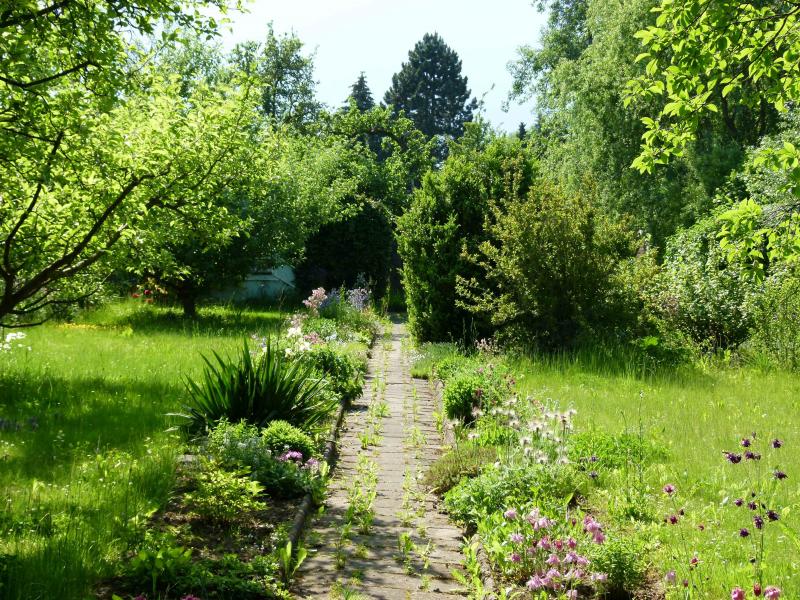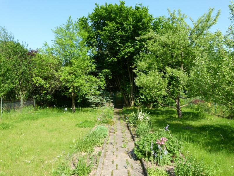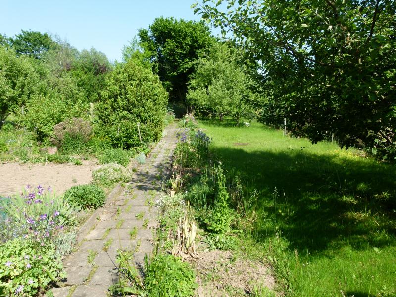 Ich habe den Garten 2012 ergattert. Er liegt nicht am Haus, sondern recht idyllisch am Stadtrand. Das Areal dort sind aber keine echten Schrebergärten, denn es gibt keine Nutzungsauflagen, es gilt lediglich das Nachbarschaftsrecht. So gibt es also durchaus hohe Bäume im Areal und die Gärten sind auch etwas größer als normale Schrebergärten. Mein Garten gehört leider zu den kleineren Parzellen im Areal und hat 600 qm, schmal und lang. Mein Garten war eigentlich klassisch wie ein Schrebergarten genutzt: langer Mittelweg, links des Weges die Apfelbäume, rechts Gemüse und Beerenobst plus etwas Rasen.