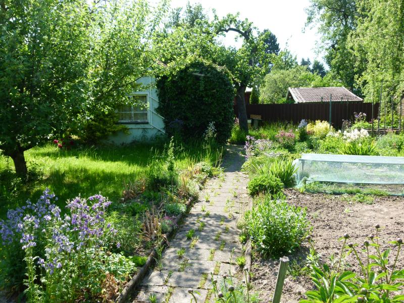 Und das ist der hintere Teil des Gartens mit der Laube und dem Gemüsegarten: