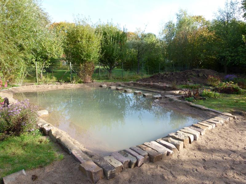 Ich habe (aus der Erfahrung mit früheren Teichen) diesen Teich nicht so nährstoffreich haben wollen, die Uferbänke habe ich daher nur mit Sand aufgefüllt, es gibt aber ein abgesondertes Becken, in dem Erde und später auch üppigeres Wachstum erlaubt ist: