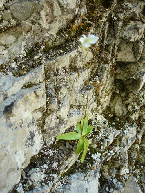 Hier die Pinguicula an einem extremen Standort. Wahrscheinlich kann sie sich Erdmangel leisten, wenn sie zwischendurch ein Tier verspeist.