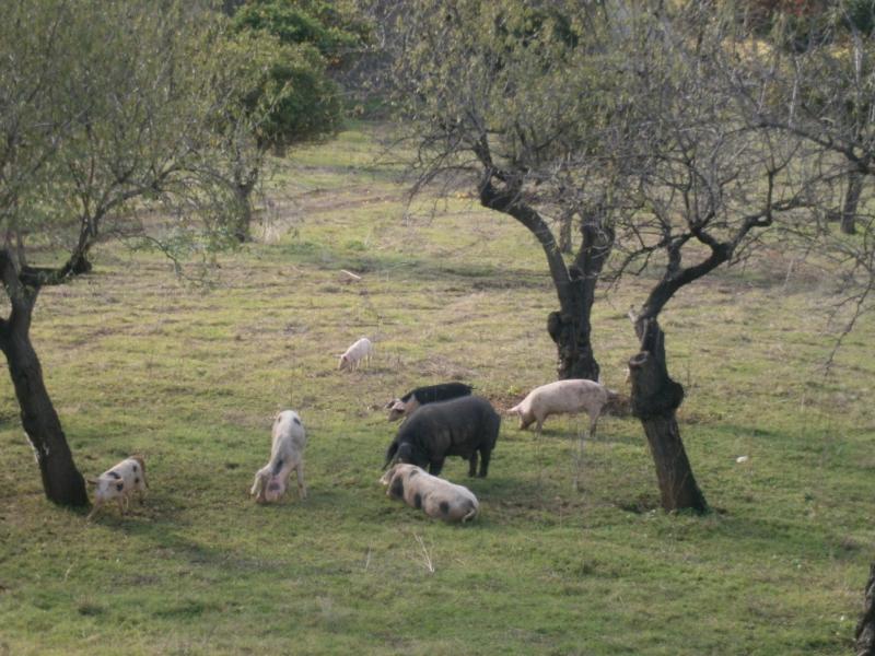 Es sind hauptsächlich Mandelbäume. Die Schweine haben ein schönes Leben, bekommen Getreide etc Obst- und Gemüseabfälle und liefern leckeren Braten. Vielleicht 20 Tiere mit Ferkel auf geschätzt ca 5000m2.
